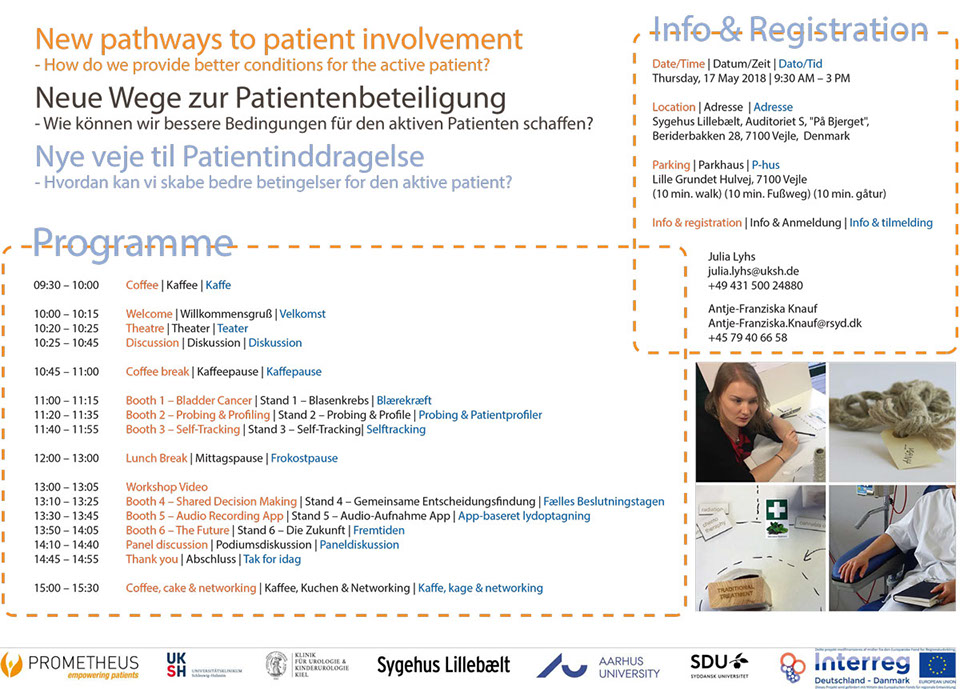 Wenn Sie Prometheus noch nicht kennen wird die Konferenz ganz besonders interessant für Sie sein. Prometheus ist ein deutsch-dänisches EU-gefördertes Interreg 5a-Projekt dessen Ziel Patient Empowerment ist. Es geht darum, die Bedingungen für die Einbeziehung von Patienten und zu verbessern, neue verständlichere Aufklärungsmaterialien zur Verfügung zu stellen und die gemeinsame Entscheidungsfindung zwischen Arzt und Patient für Krebspatienten in Deutschland und Dänemark zu verbessern.